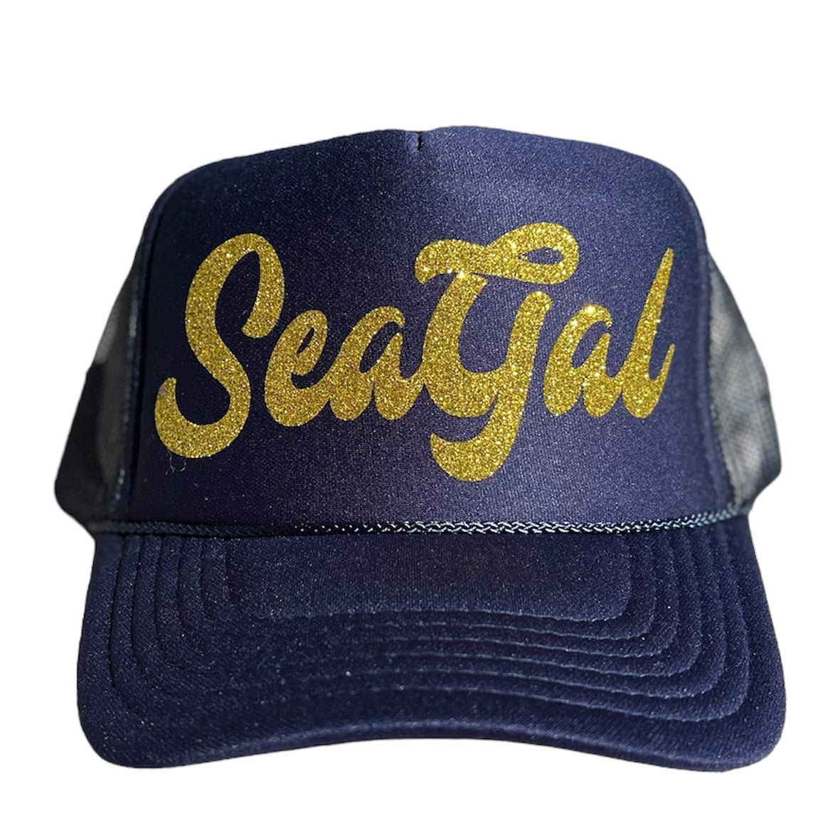 Navy Blue Hat w/Sea Gal printed in Gold Glitter - Five Panel High Crown Mesh Back Trucker Hat, Polyester Foam Front w/Lining