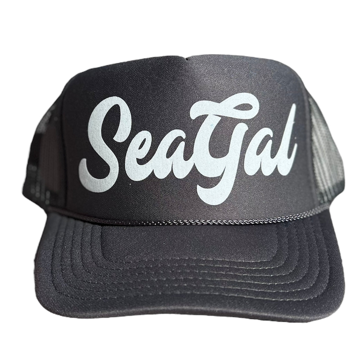 Charcoal Grey Hat w/Sea Gal printed in White Glitter - Five Panel High Crown Mesh Back Trucker Hat, Polyester Foam Front w/Lining
