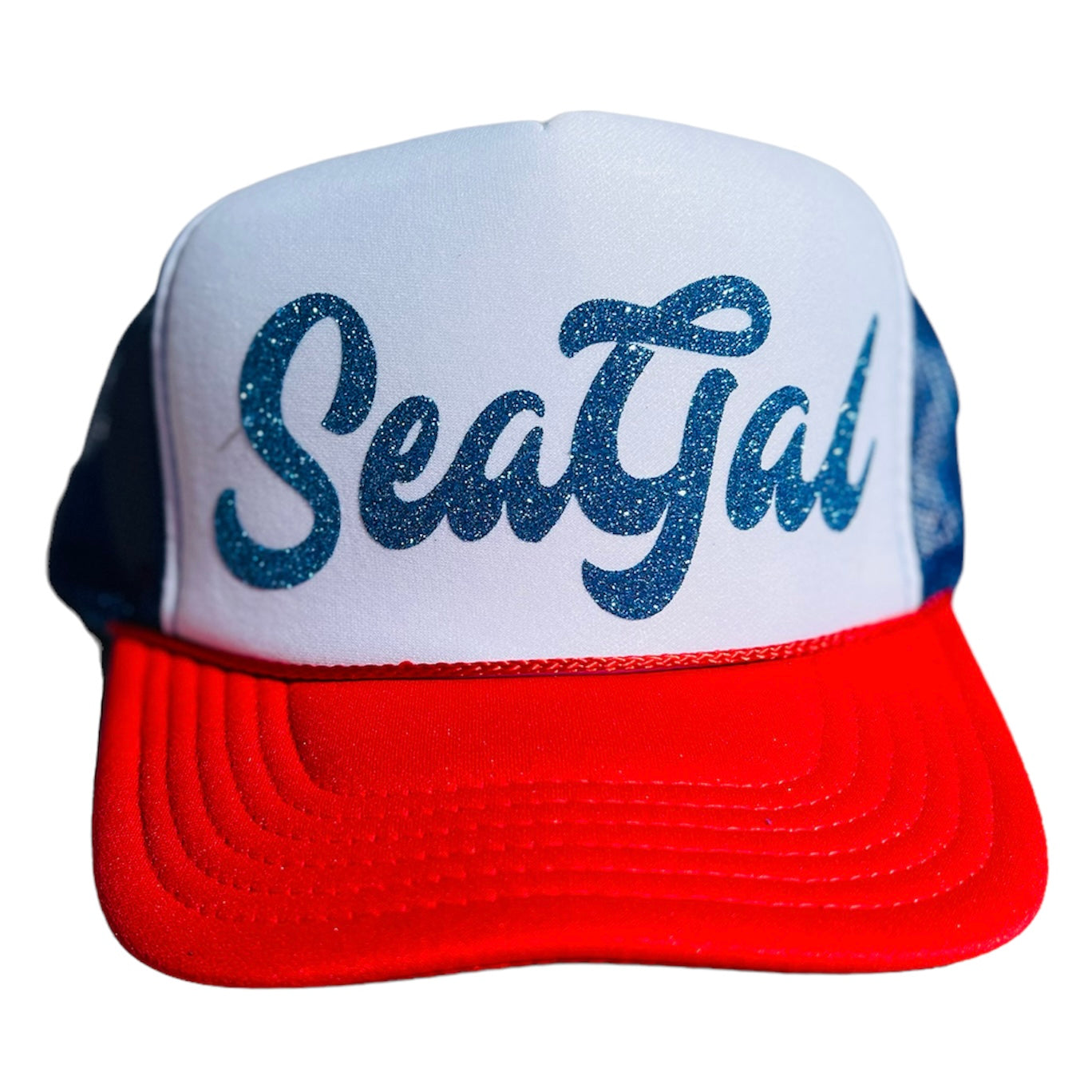 Red, White & Blue Hat w/Sea Gal printed in Blue Glitter - Five Panel High Crown Mesh Back Trucker Hat, Polyester Foam Front w/Lining